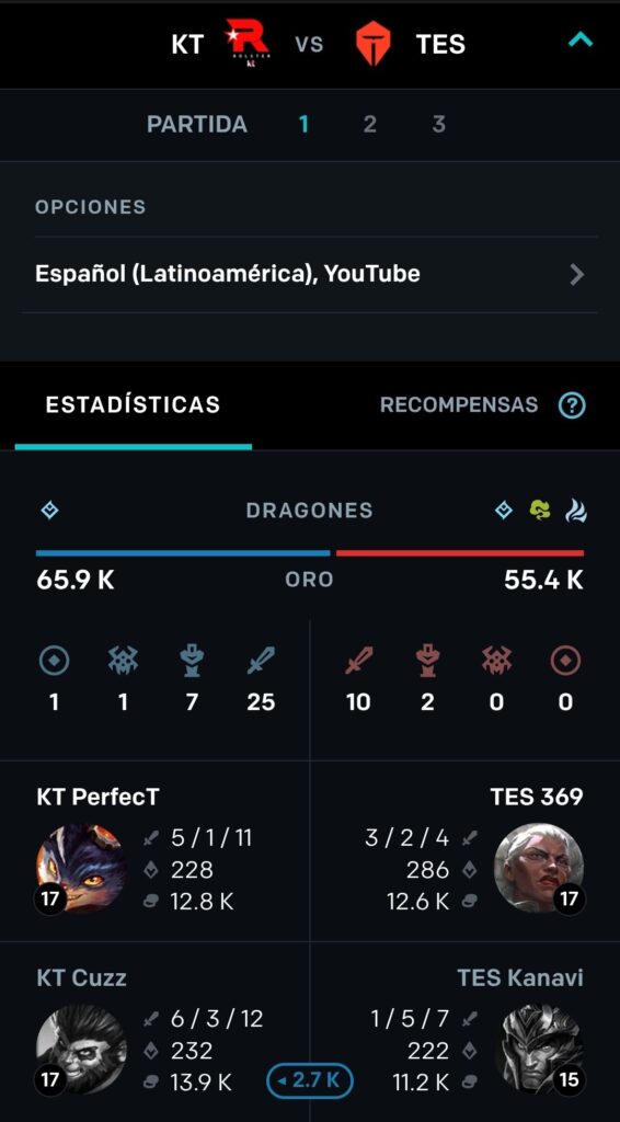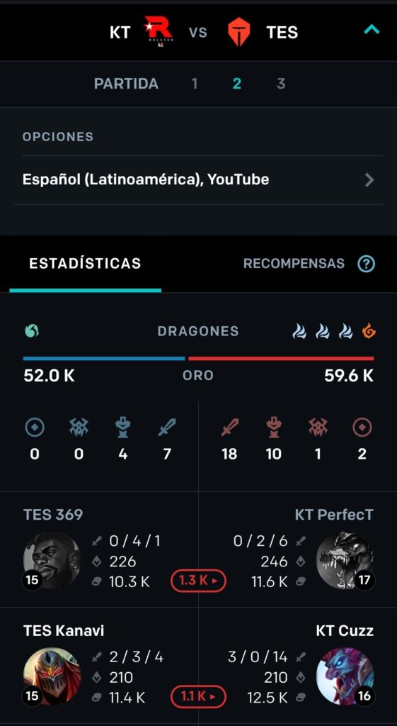TES intentó responder con un draft agresivo de Zed y Cassiopeia, pero KT leyó todo. Cuzz volvió a brillar (3/0/14) y Bdd fue una pesadilla (5/1/11). Aunque TES aseguró los cuatro dragones, KT cerró con 18-7 en kills y casi 8 K de oro arriba, mostrando que las estadísticas no siempre explican la realidad: la partida nunca estuvo en duda.