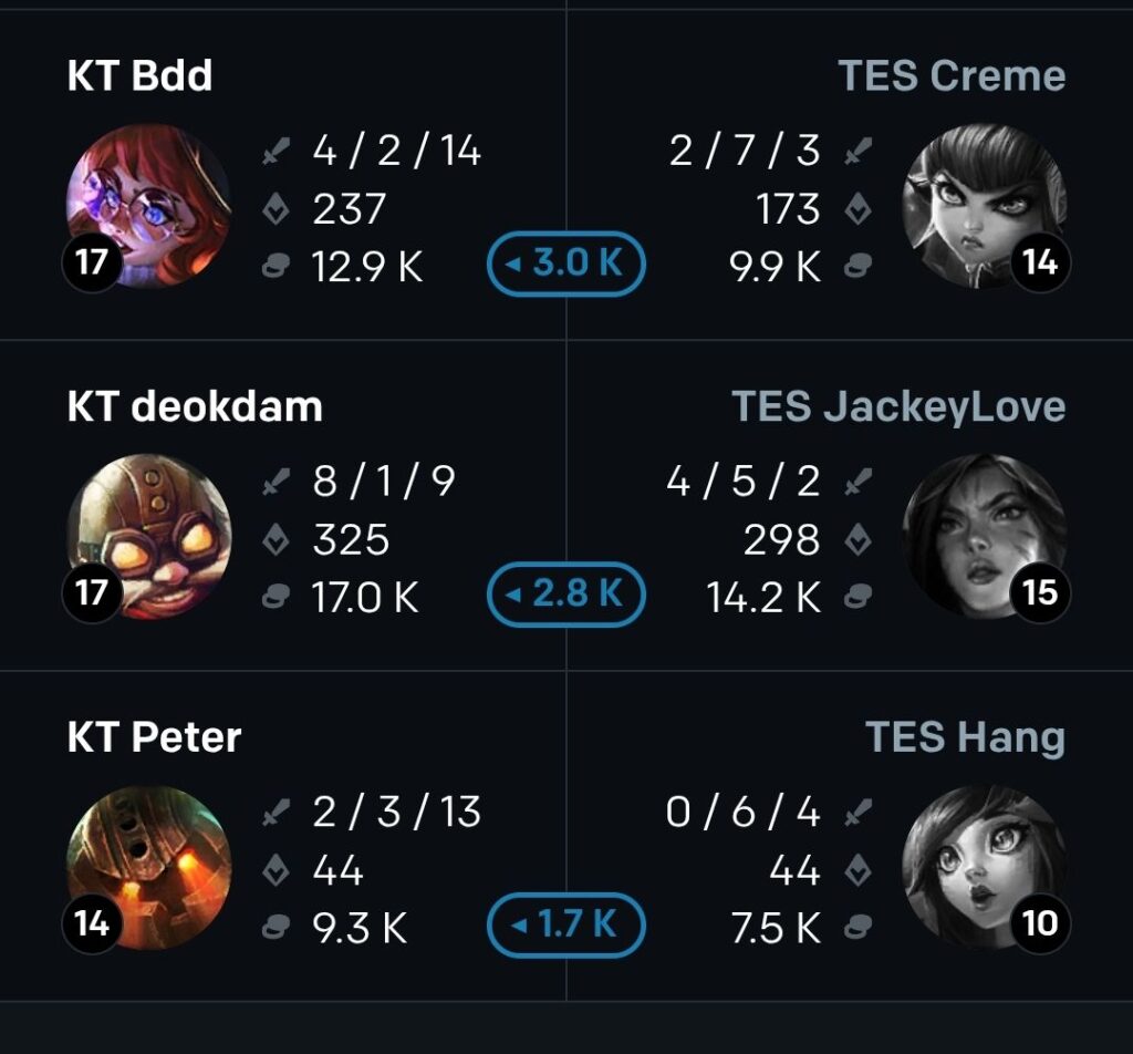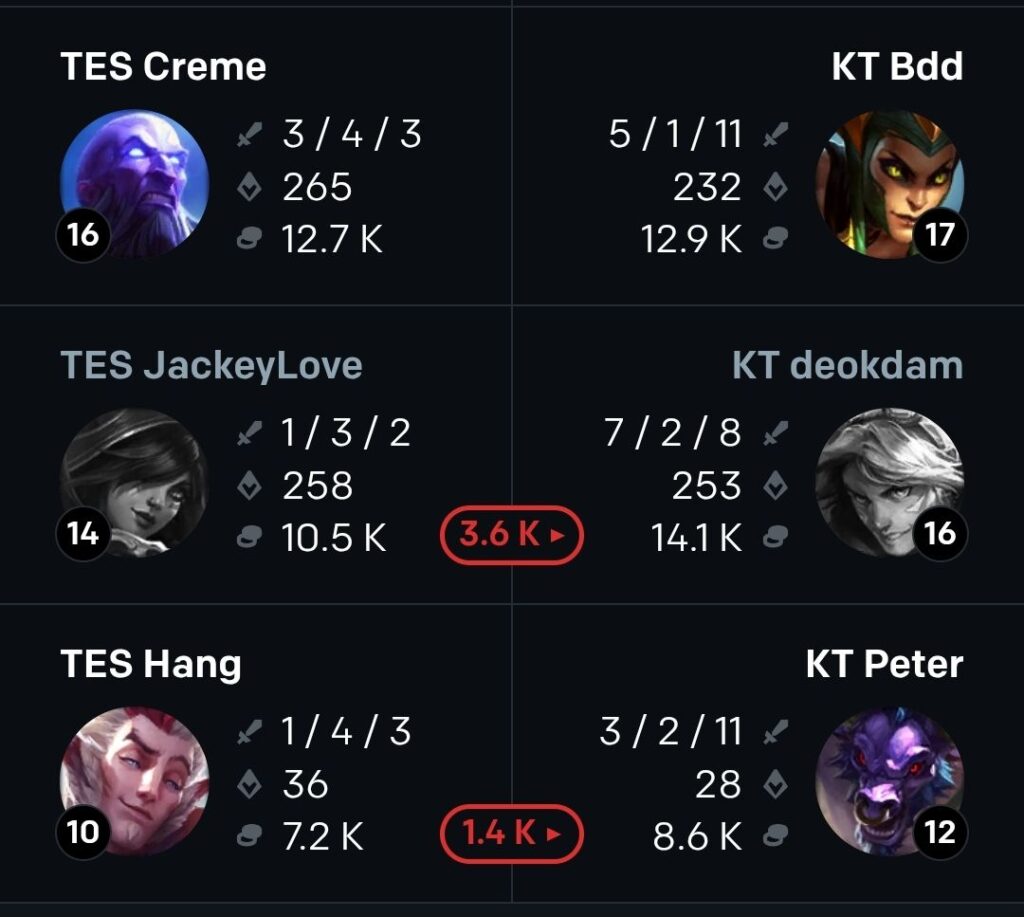 Desde el primer dragón, el partido fue una clase de control. KT cerró el juego 25-10 en asesinatos, 65.9 K vs 55.4 K de oro, y una diferencia de siete torres a dos. deokdam (8/1/9) y Bdd (4/2/14) dominaron cada rotación mientras Cuzz impuso su ritmo de jungla (6/3/12). TES simplemente no pudo jugar mapa: sin barones, sin torres y sin alma de dragón, se desangró en visión y macro.